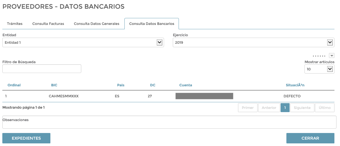 Desde esta pestaña, el proveedor podrá consultar los datos bancarios que constan en la aplicación contable de la organización que está integrada con eXperta.